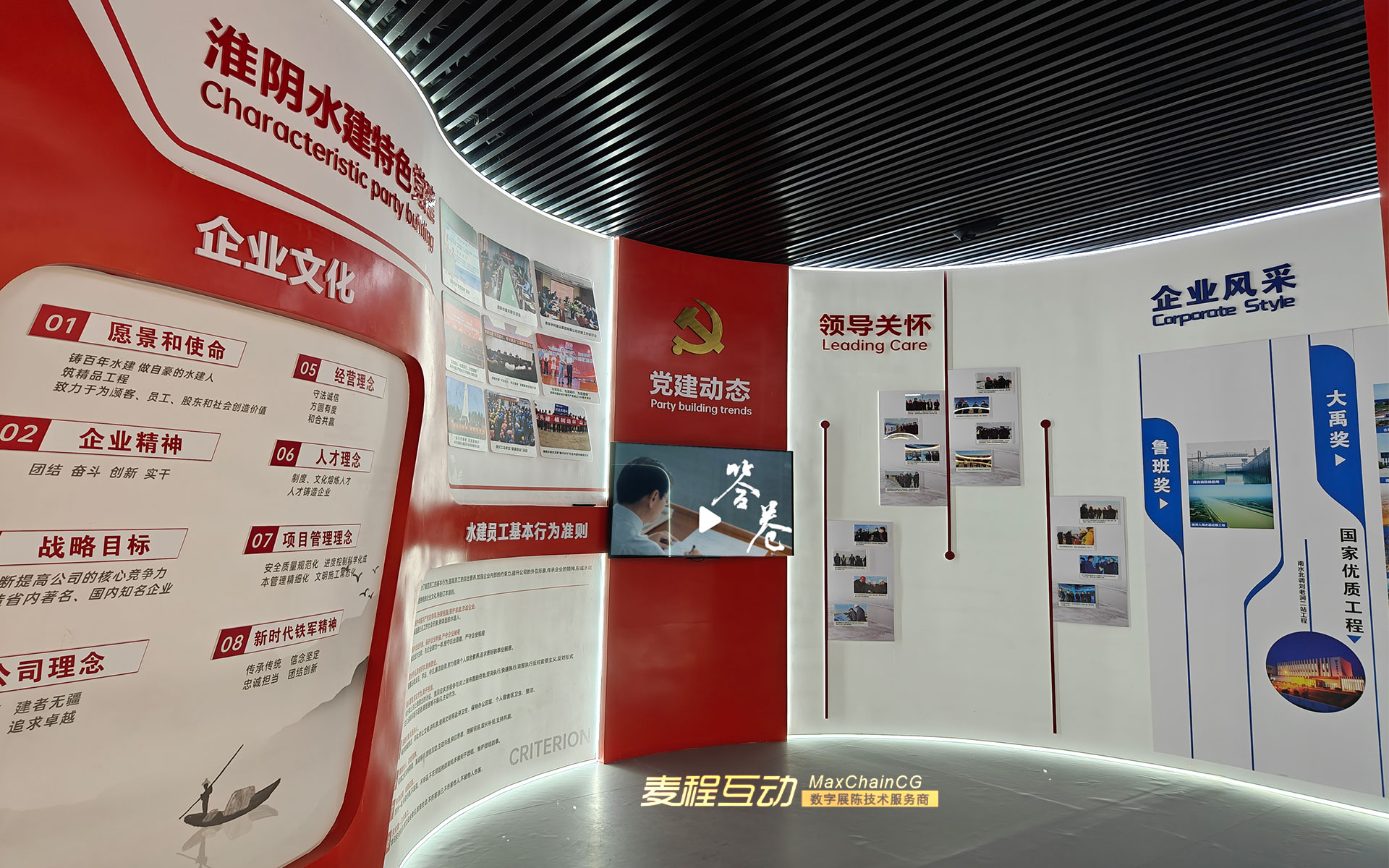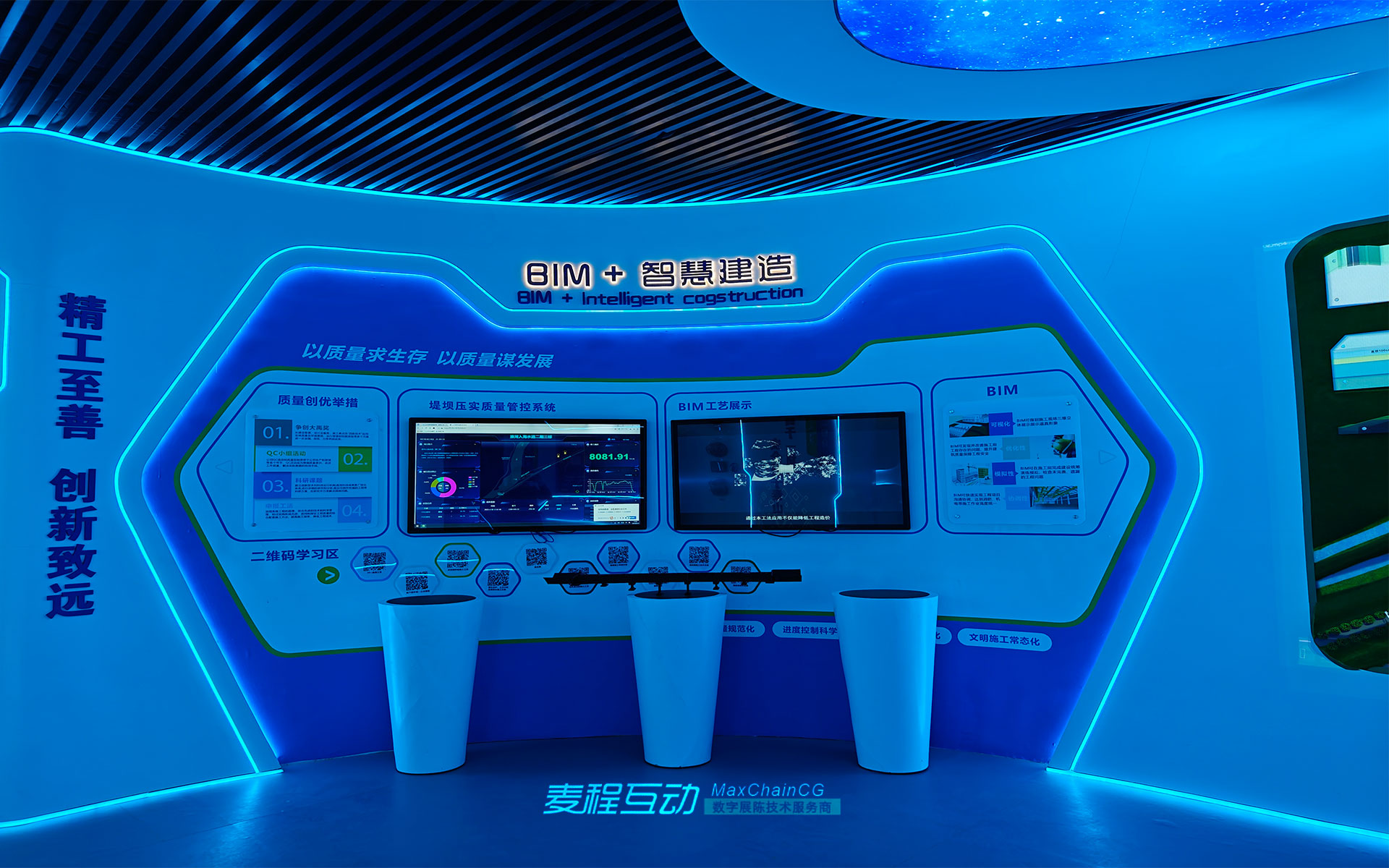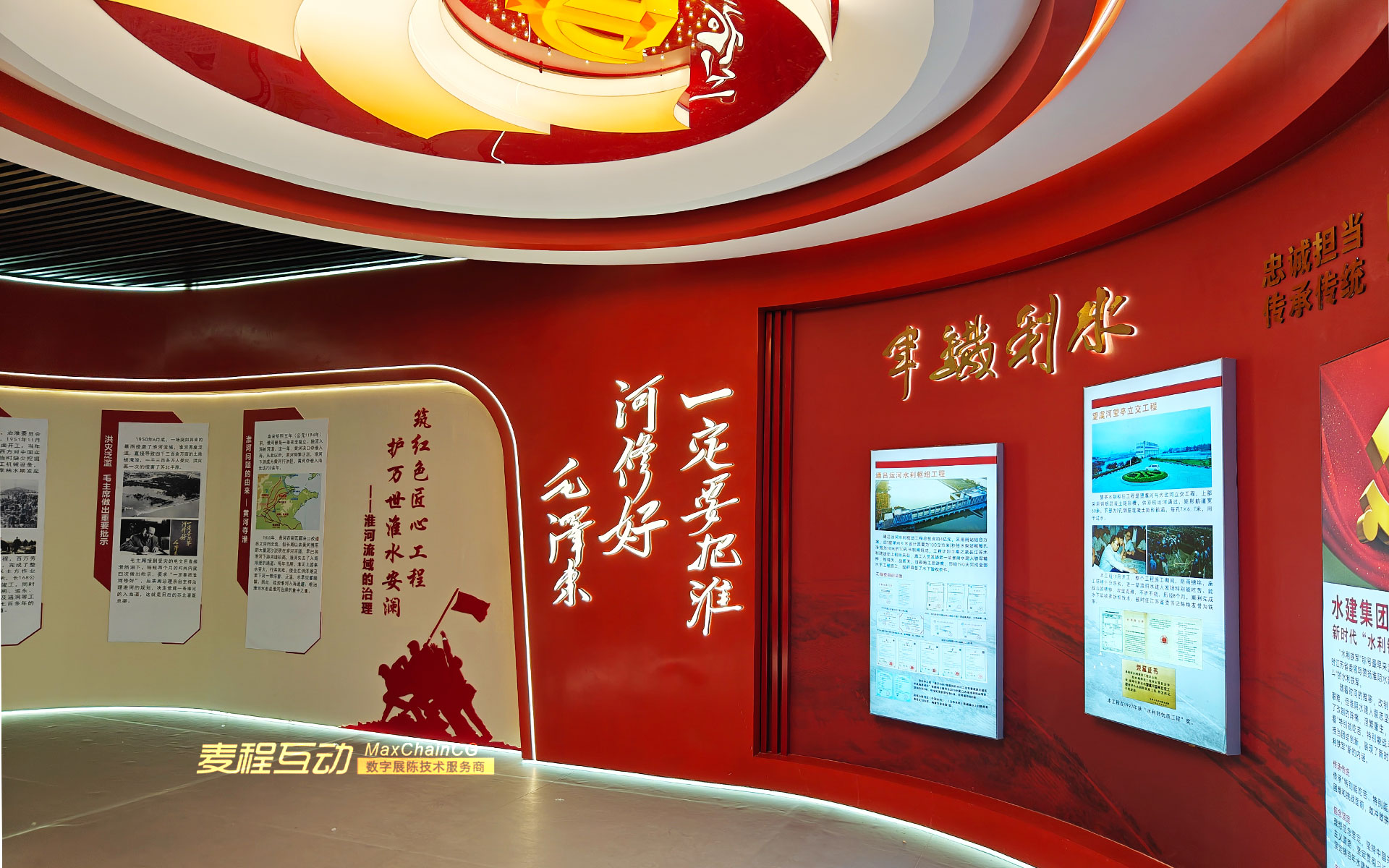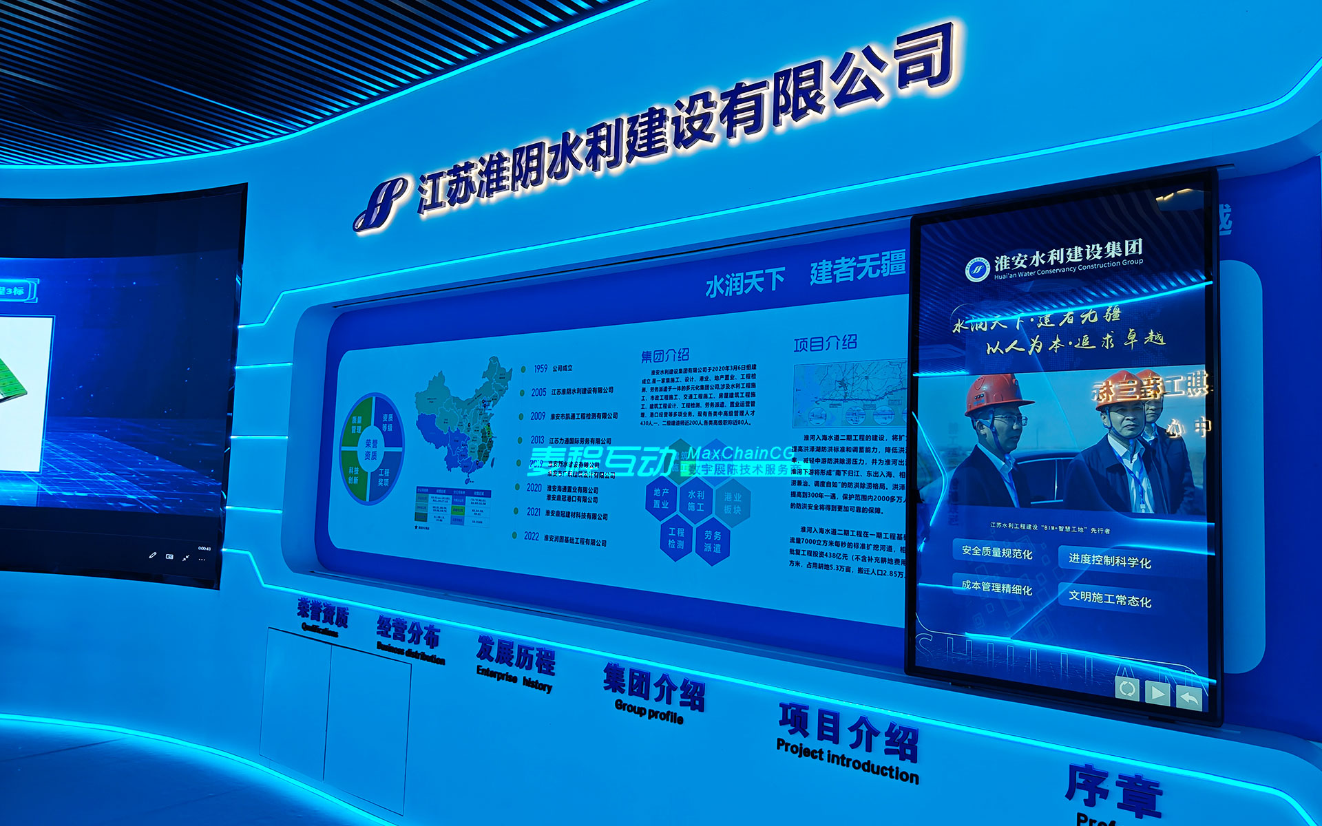 麦程互动科技在听取了淮阴水利对该项目的智慧建造中心智慧展厅的要求后,充分理解甲方的项目需求重点展示淮阴水利近年来关于数字孪生水利工程建设的成果,将BIM、人工智能、物联网、云计算、大数据等新一代信息技术深度应用于水利工程施工的案例较好融合在项目介绍中,在此基础上,深度挖掘项目渊源,将淮河的治理历史和淮阴水建的水利铁军精神相结合,体现了水利人优良品质的的传承和发展,该展厅的建设结果得到了甲方的高度肯定。