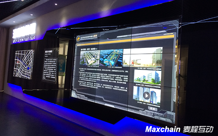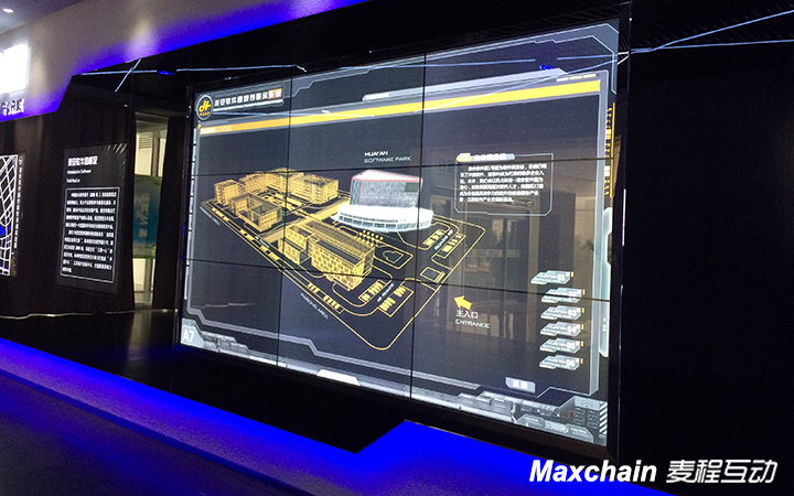 在展厅的设计上,我们根据已经有的结构将展厅分为3个区域.第一个部分比较概括性的介绍软件园的构成,地理区位,功能划分。用3D虚拟现实技术,3D再现园区模型,直观,形象,可以非常清晰的了解园区的情况。