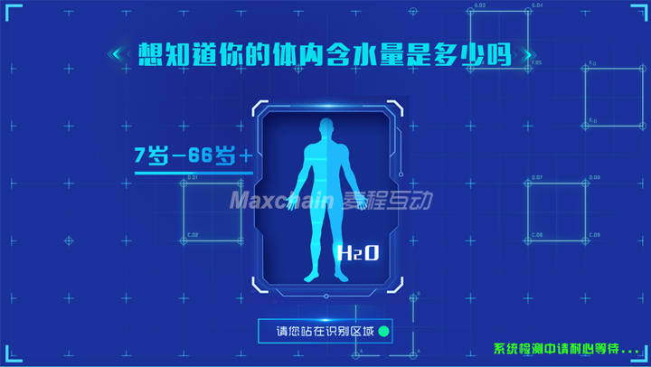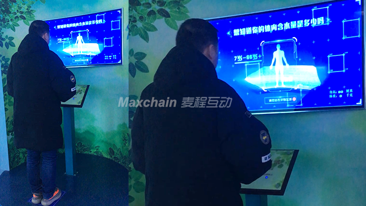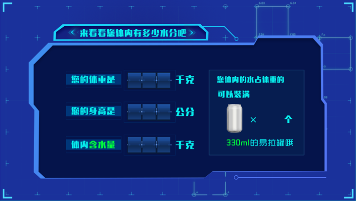 人体的含水量根据年纪和体重获得。采用重量感应装置和超声波测量装置,精确测得参观者的身体数据,根据设定的公式结合年龄得出参观者的人体含水量,并直观的用日常生活中常用的易拉罐可乐瓶等物品容量进行类比. 该软件和硬件装置适用于科教馆、科普馆、青少年科学教育基地、节约用水展示馆。