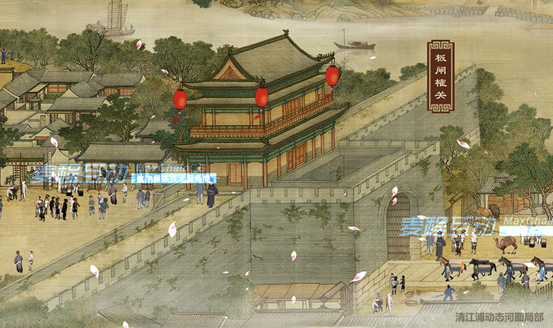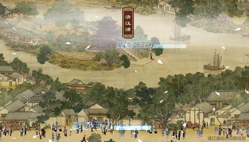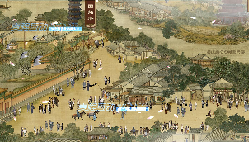 清江浦河图 动态壁画是仿照清明上河图的画卷风格制作的具有淮安本地运河文化特色的动态画卷,动态壁画按照卫星图定位,重现淮安古代作为运河之都漕运咽喉的盛景,画卷中着重展现了淮安清江浦浦楼、榷关、闸口、国师塔、文庙、清晏园、大运河河畔千帆等具有特色和代表性的文化元素,利用动画手法让古画“活”起来。清江浦动态壁画刻画了百余位百姓、客商、官员、垂钓、手工业者等各个形象的动态角色动画,充分反映清江浦运河畔的熙攘景象。
